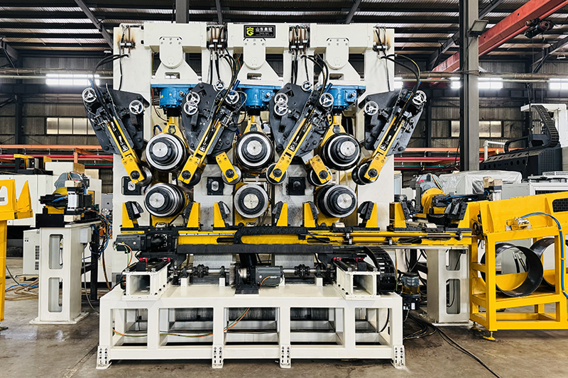 После процесса развальцовки колесный обод поступает на первую из трех типовых профилегибочных машин, где ей постепенно придается требуемый ободной профиль. Профилегибочный станок используется при производстве стальных колес для формирования точных размеров колесных дисков с помощью процесса холодной гибки, позволяющего создавать как симметричные, так и асимметричные конструкции ободов, соответствующие различным спецификациям и стилям колес. Профилегибочный ролик машины приводится в действие полностью гидравлической системой и обеспечивает плавную и эффективную формовку обода, достигая точных окончательных контуров, необходимых для изготовления высококачественных колесных ободьев.